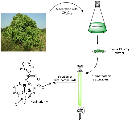 A clerodane type diterpene, nasimalun A was isolated from a dichloromethane extract of the leaves of Croton oblongifolius Roxb. Nasimalun A showed moderate cytotoxicity toward MOLT- 3 cell line with IC50 value of 26.44 µg/mL. Furthermore, nasimalun A showed minimum inhibitory concentration (MIC) of 50, 12.5, and100 µg/mL for Bacillus cereus and both Staphylococcus aureus, and Staphylococcus epidermidis respectively.